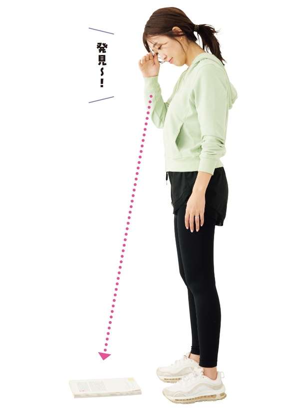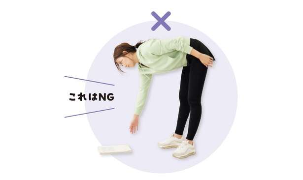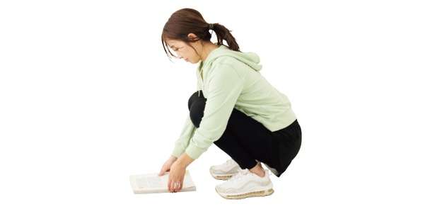 手だけではなく、脚も使ってもの拾い。足を肩幅に開き、しゃがんで片付けたいものを拾う。