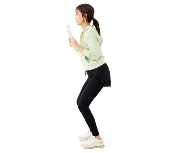そのまま真上に立ち上がる。完全にしゃがみ込んで立ち上がるスクワット。