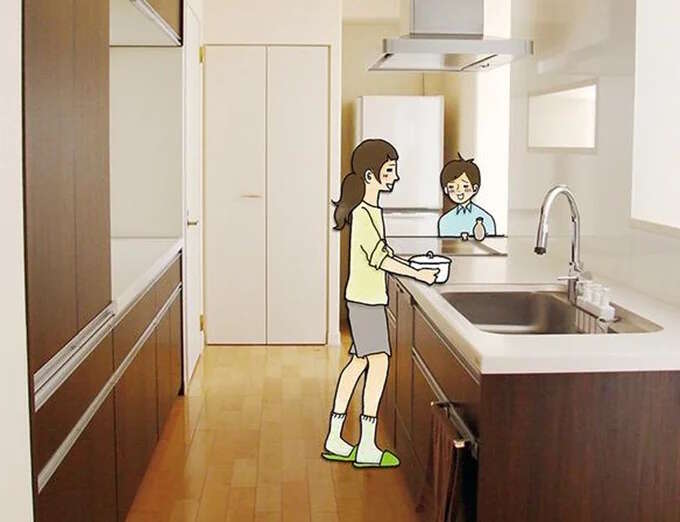 汚家時代の台所(「キッチン」なんて言葉は似合わない)は、家の北側に位置するひっそりと暗い場所でした。当然、ここも物に溢れていたので、非常に狭く2人立つのがやっと。氷で冷やす昔の冷蔵庫なんてものもあったっけ。そんな台所なので、私は狭さを理由にろくに手伝いもせず、母はひとり黙々と家族の食事を作り続けていました。寂しい思いをさせ続けて申し訳なかった...。そこで新しい家では、寂しくないキッチンにしようと、心に決めたのです。