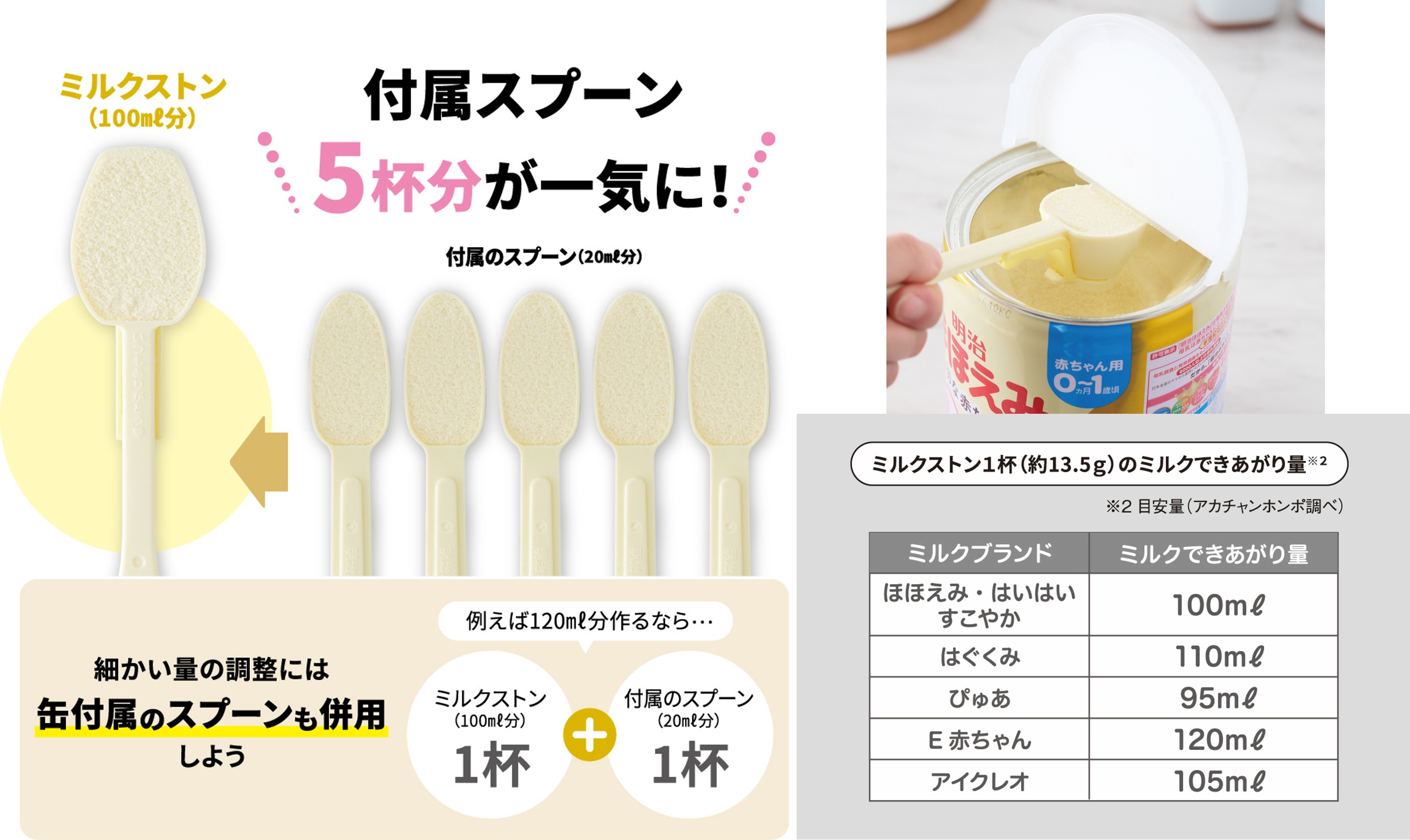 ※ミルクストンは、ミルク缶付属の専用スプーン1 杯(約2.7g)でミルクできあがり量が20mLの粉ミルクを基準にしています。