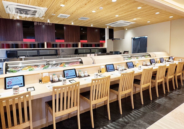 うまい鮨勘 ゆとろぎは、「ゆっくりくつろげる空間」をコンセプトにした、暖簾(のれん)で仕切られる半個室の新しい回転寿司。 レーンで運ばれてきた商品は、ベルトコンベアでテーブル中央に押し出される斬新な配膳システム。さらにタッチパネルオーダーで、お食事中の会話も途切れることがありません。