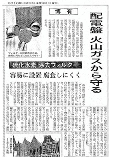 メディア掲載・評価について当社の製品につきましては2016年4月、日本経済新聞にて「火山ガスの脅威から住宅を守る画期的なフィルター」として紹介され、その驚異的な吸着力が公に証明されました。